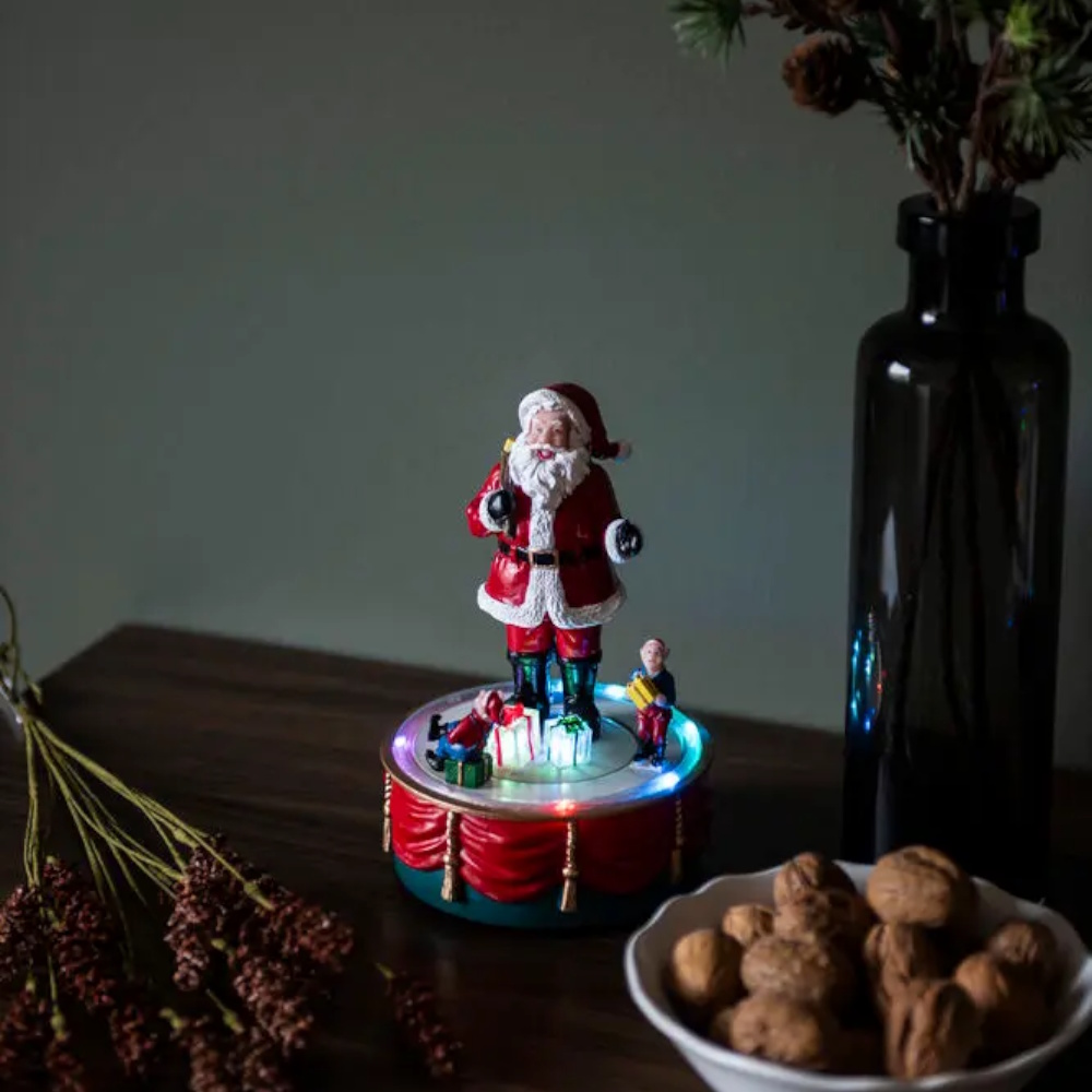 Batteridrevet julemand, der snurrer og spreder en ægte julestemning med stemningsfuld belysning og musik (8 sange), har en 6-timers timer.