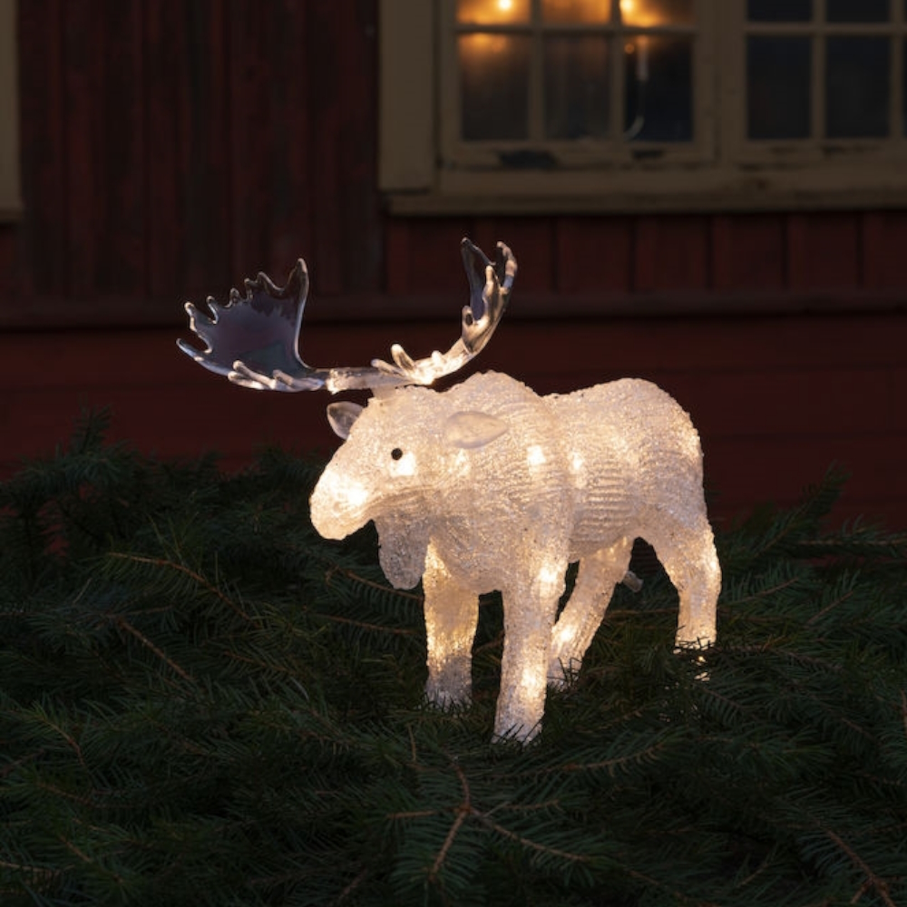Elegant elg med 24 LED-lys, der spreder et funklende varmt hvidt lys. Lavet af slidstærk og langtidsholdbar akrylplast, til indendørs og udendørs brug. Skovens konge er nem at placere og bliver en smuk lysdekoration, der lyser mørket op med en magisk vinterfølelse.