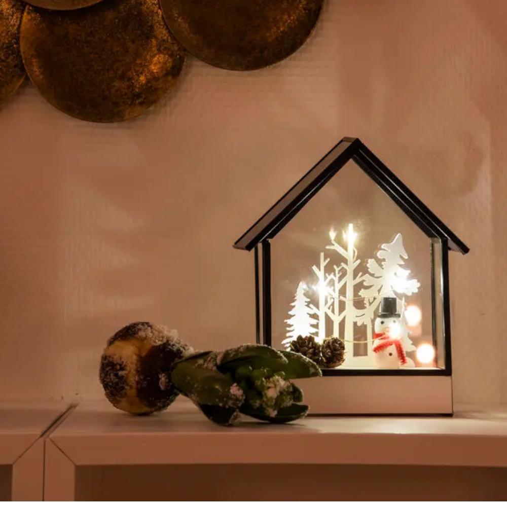 Charmerende glaslanterne med detaljerede silhuetfigurer og snemand, med 6-timers timer og mulighed for både batteri- eller USB-drift.