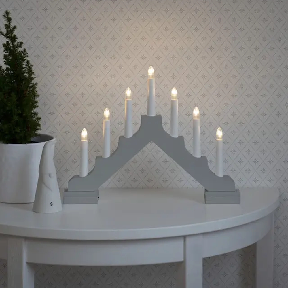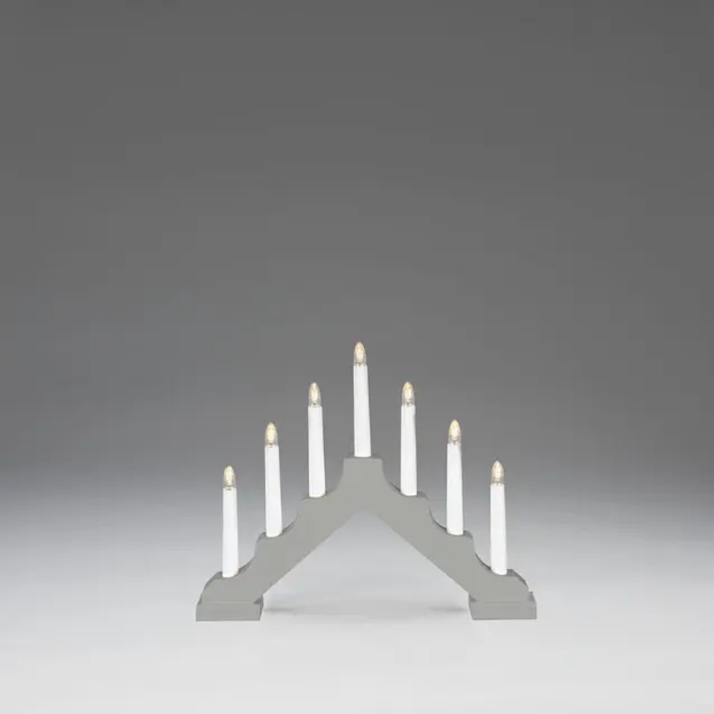 Batteridrevet 7-armet adventsstage i træ med varmt hvidt LED-lys, lakeret i matgrå, lyskilderne kan ikke udskiftes.