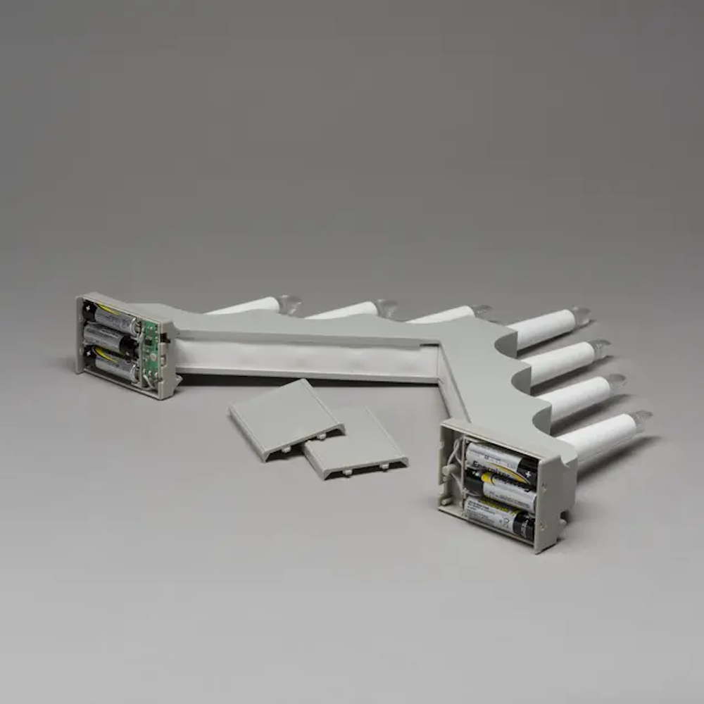 Batteridrevet 7-armet adventsstage i træ med varmt hvidt LED-lys. Lakeret i matgrå. Lysestagen er velegnet til steder, hvor stikkontakter er svære at nå, da den drives af 6xAA-batterier og har en 6-timers timer. Lyskilderne kan ikke udskiftes.