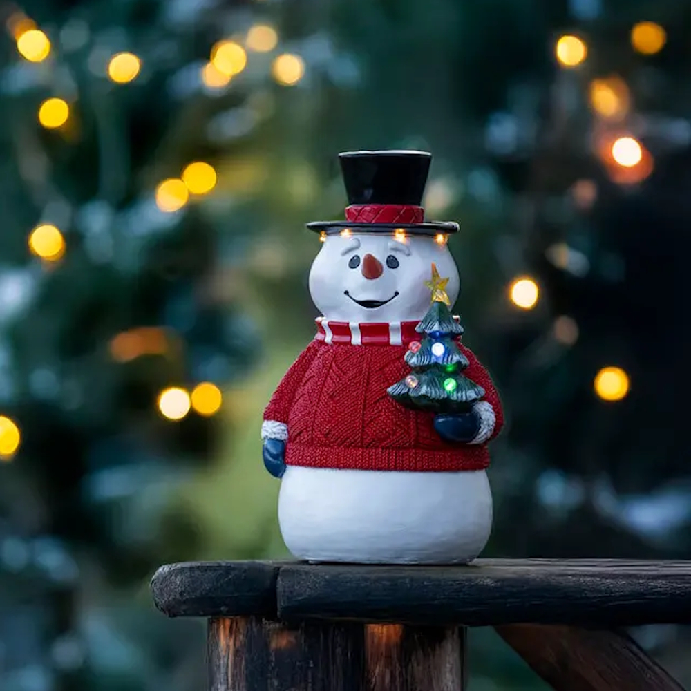 Snemand med høj hat og juletræ med flerfarvede LED'er, juledekorationen har en 6-timers timer, drevet af 3xAA-batterier.