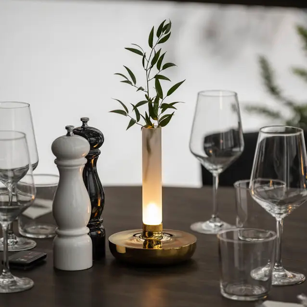 Biarritz er en elegant, genopladelig loungelampe formet som en vase med justerbar belysning, hvor du kan vælge farvetemperatur 1800/2700/4000K og er dæmpbar. Pynt din borddækning med blomster og hyggeligt lys. Oplades via USB og har en batterilevetid på cirka 9 timer ved fuld lysstyrke. Tænd/sluk-knap nedenunder. Guldlakeret rustfrit stål.
