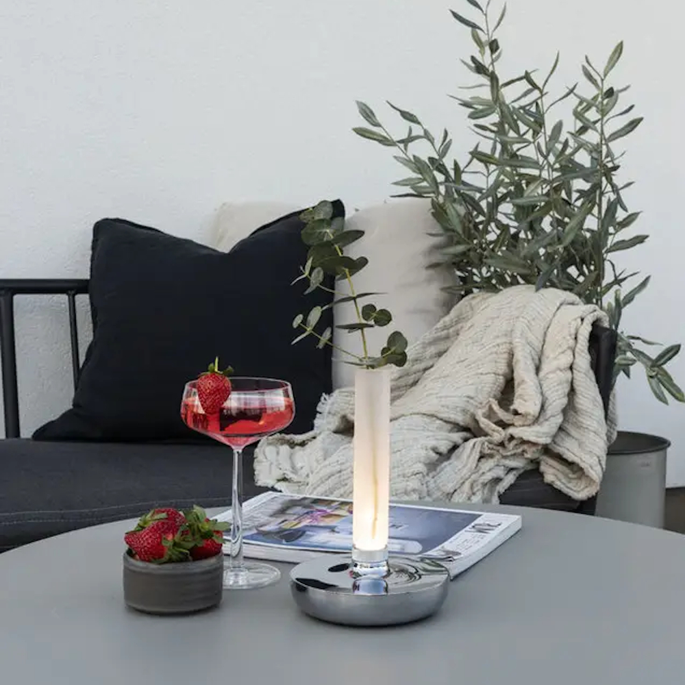 Biarritz er en elegant, genopladelig loungelampe formet som en vase med justerbar belysning, hvor du kan vælge farvetemperatur 1800/2700/4000K og er dæmpbar. Pynt din borddækning med blomster og hyggeligt lys. Oplades via USB og har en batterilevetid på cirka 9 timer ved fuld lysstyrke. Tænd/sluk-knap nedenunder. Sølvlakeret rustfrit stål.