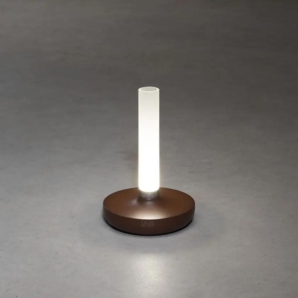 Biarritz er en elegant, genopladelig loungelampe formet som en vase med justerbar belysning, rustlakeret rustfrit stål.