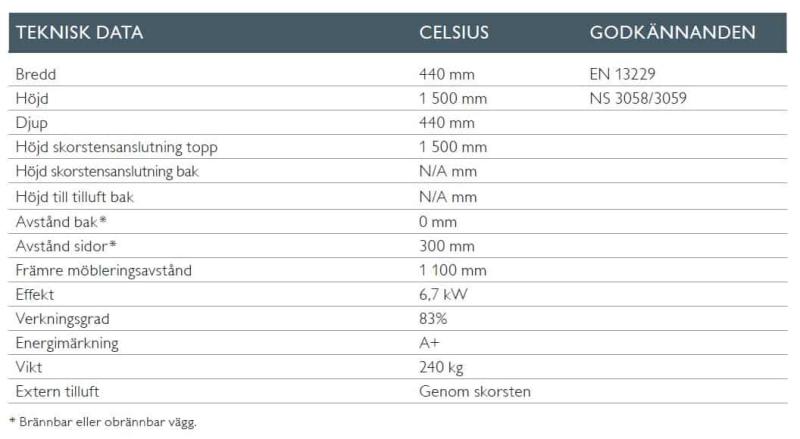 Tack vare egenskaperna hos pimpstenen så kan en Celsius monteras direkt mot ett brännbart material på baksidan och 300 mm från brännbart i sidled.