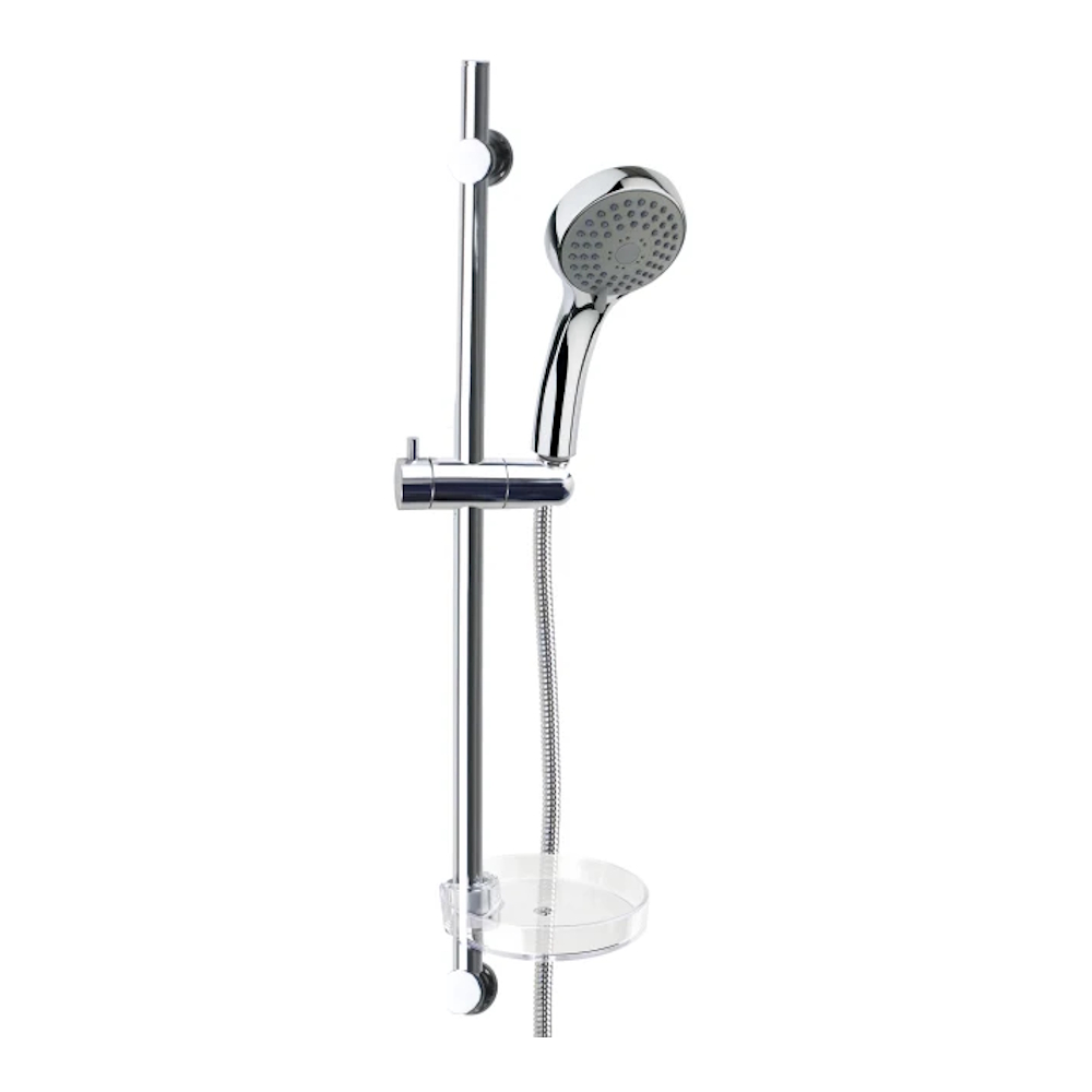 Krom brusesæt. Håndbruser med anti-kalk funktion og 3 forskellige dyser. 750 mm brusestang diam. 19 mm udvidelig metalslange 1500 mm, sæbeskål og skyder med push-funktion.