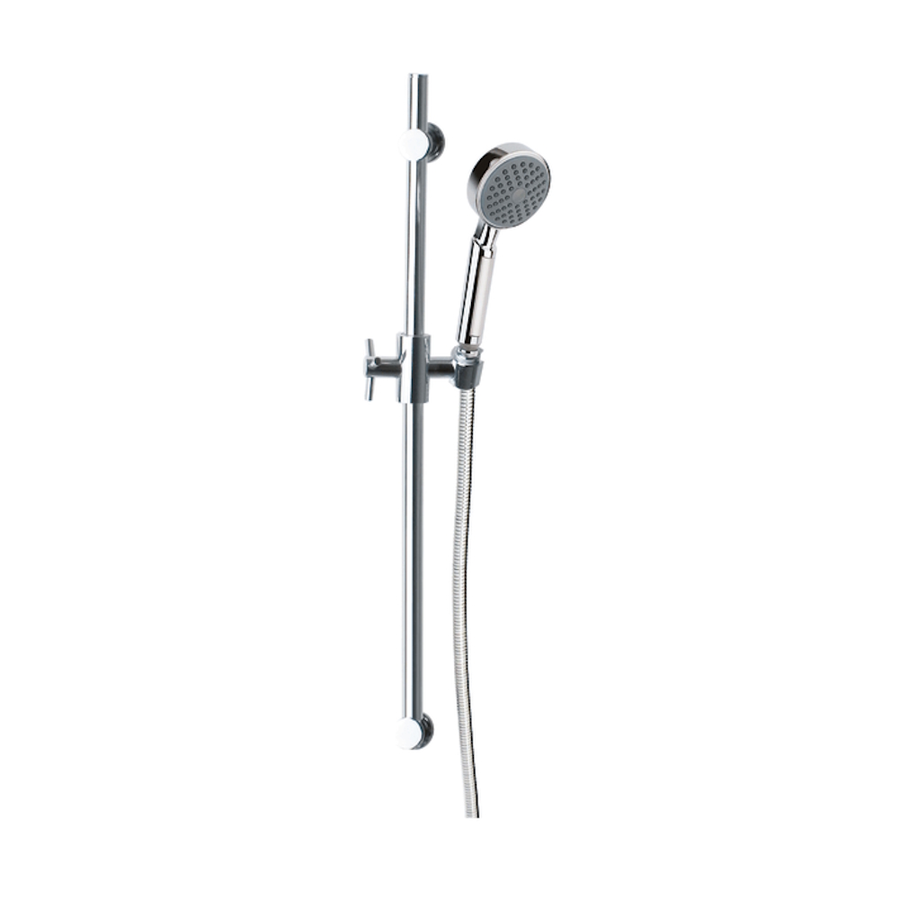 Krom brusesæt, Håndbruser med anti-kalk funktion, 750 mm brusestang med diameter 24 mm. 19 mm, udtrækbar metalslange 1500 mm, sæbeskål og skyder med push-funktion.