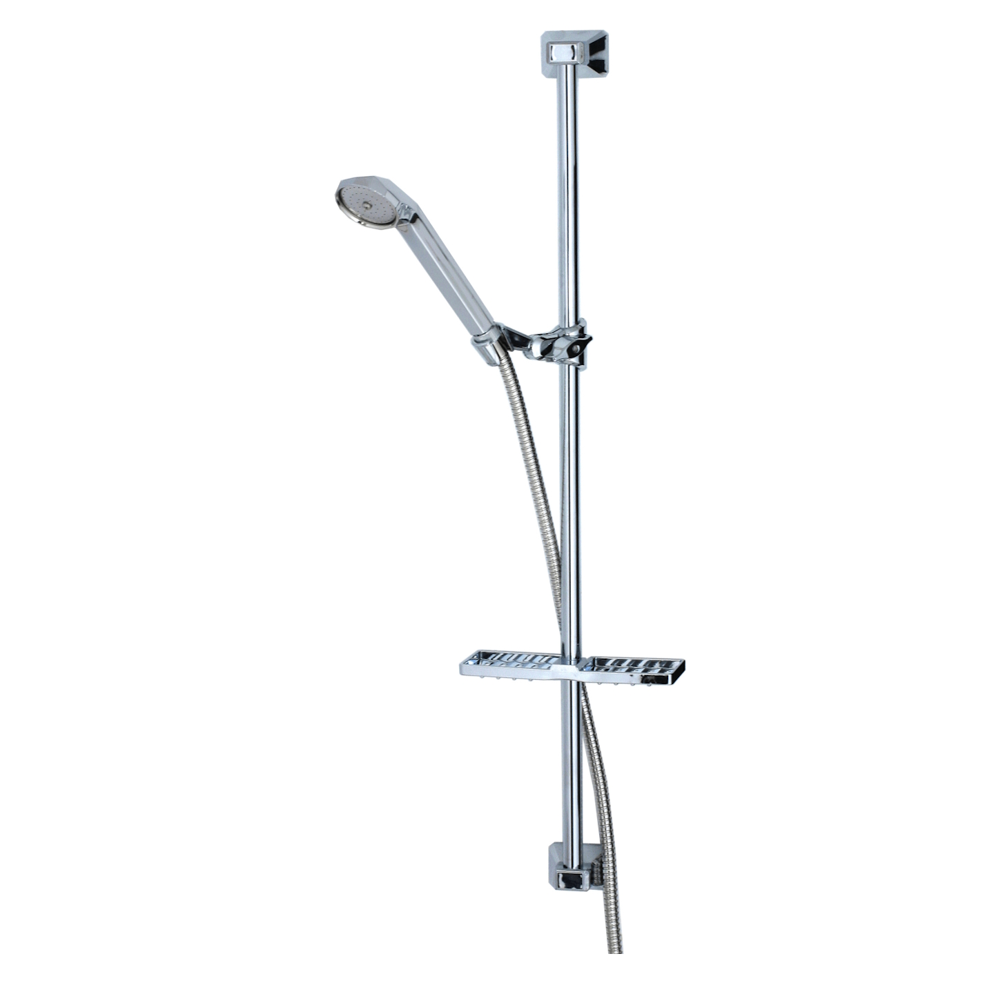 Strålende brusesæt med 750 mm stang, slange, håndbruser og sæbe/shampoo hylde.