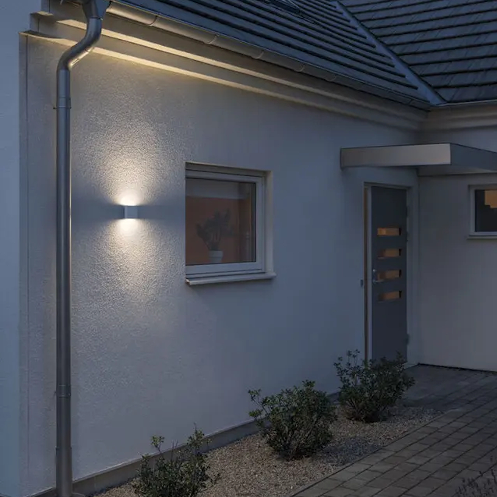Væglampen LED er en stilfuld facadebelysning, der lyser både opad og nedad og skaber smukke skygger på væggen. [Energiklass G]