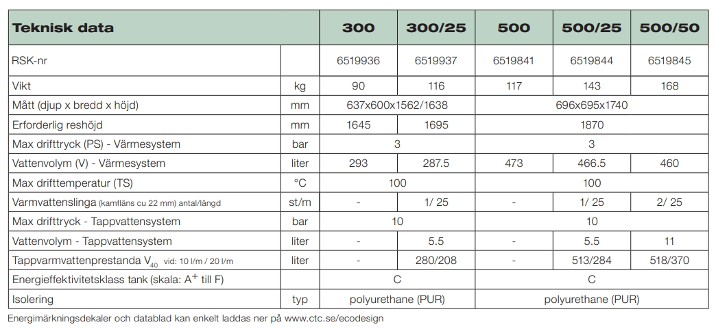 CTC 300/25 klarar av att täcka varmvattenbehovet för en normalvilla. CTC 500 klarar av att täcka varmvattenbehovet upp till 10 lägenheter och CTC 750 upp till 15 lägenheter. Vid större tappvarmvattenbehov kan de dessutom kaskadkopplas.