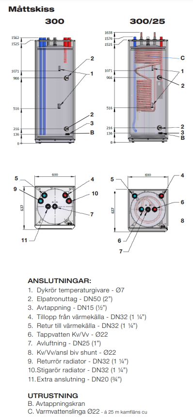 Slingtank 300 med 1x25 meter varmvattenslinga (cu 22 mm á 5,5 l), anslutning 1 ¼”, uttag för två elpatroner 2", ett dykrör för givare, avtappning/termometer ¾", rektangulär. Lämplig som första tank i vedsystem.