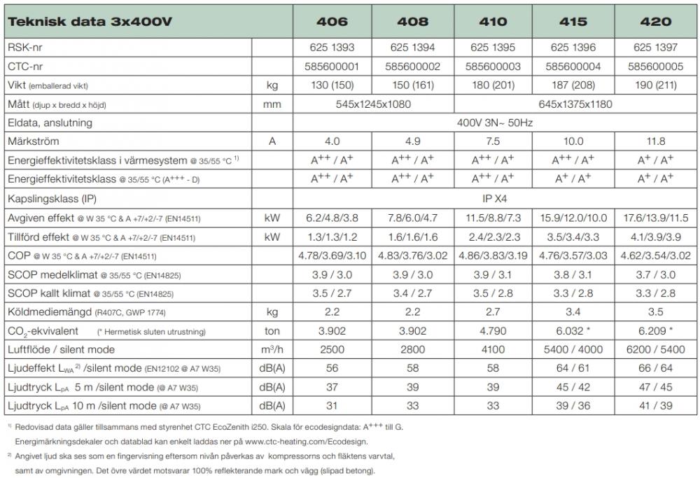 - Kompressortyp: Scroll. - Ljuddata 10 m: 31 dB(A) - Ljudstyrka: 56 dB(A) - Luftmängd: 2500 m³/h - CO2-ekvivalent 2): 3,902 ton - Nominell värmeeffekt (Pdesignh) 35/55°C: 5/5 - COP: 4.78/3.69/3.10 - Tillförd effekt kW: 1.3/1.3/1.2 - Avgiven effekt kW: 6.2/4.8/3.8 - Köldmediemängd (R407C, fluorerad växthusgas GWP 1774): 2,2 kg - SCOP kallt klimat 35/55 °C (EN14825): 3.5/2.7 - Energiklass värme 35/55°C (utan styrning): A++ / A+ - Energiklass värme 35/55°C (i paket med styrning): A++ / A+
