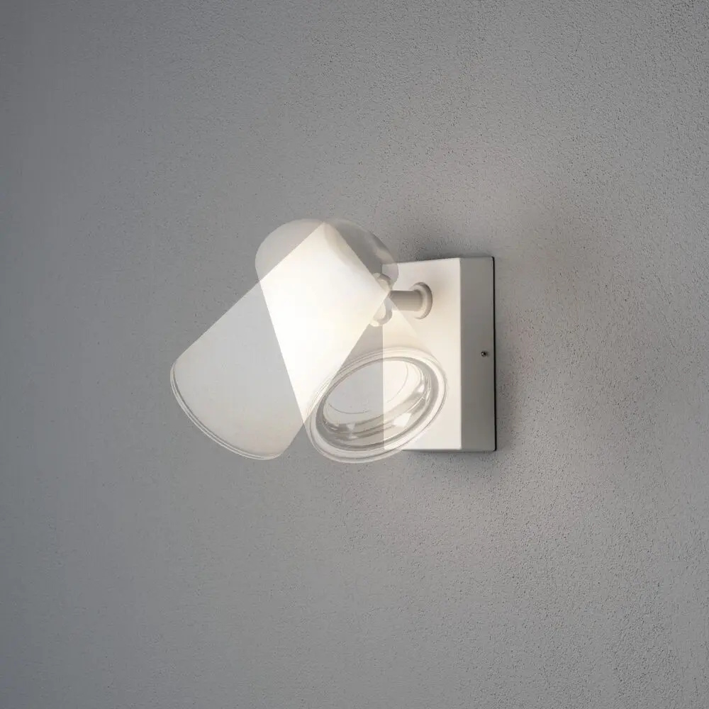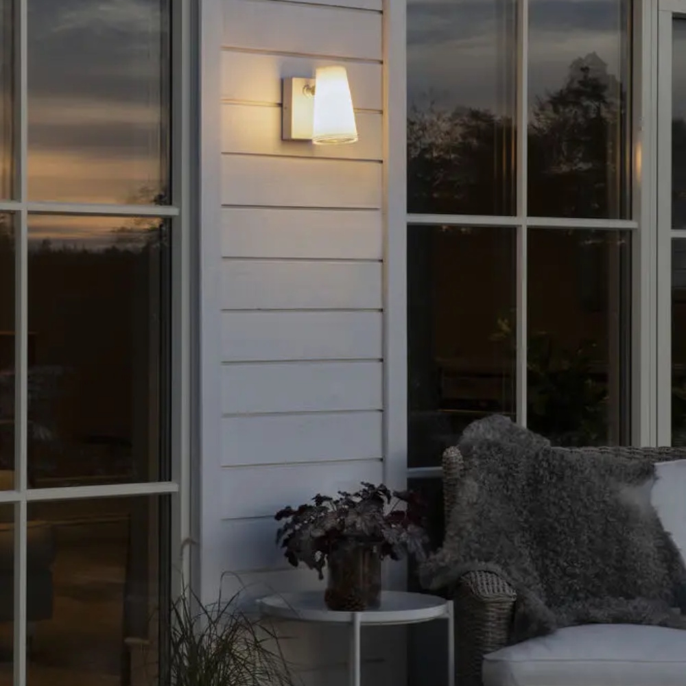 Fano facadebelysning er en stilfuld væglampe i hvidlakeret aluminium med en skærm i opal akrylglas. Skærmen kan rettes sidelæns og opad. E27-fatning til en lyskilde på maks. 25W (Lyskilde medfølger ikke).