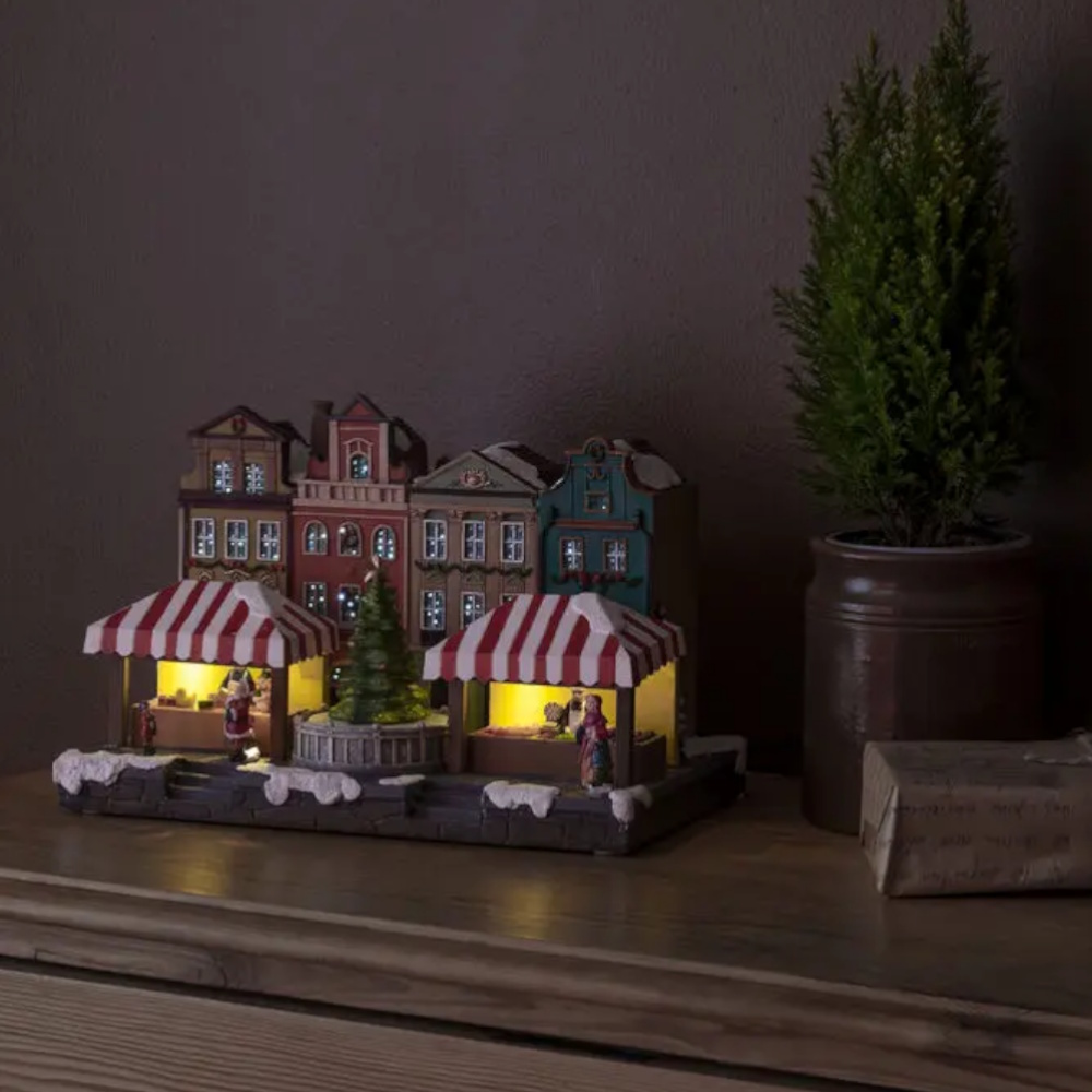 Hyggelig julelandsby med julemarked og roterende juletræ – en lille eventyrverden, der indfanger følelsen af en sprudlende jul. De detaljerede figurer og den atmosfæriske belysning giver en varm og indbydende julestemning. Inkluderer musik (8 julesange).
