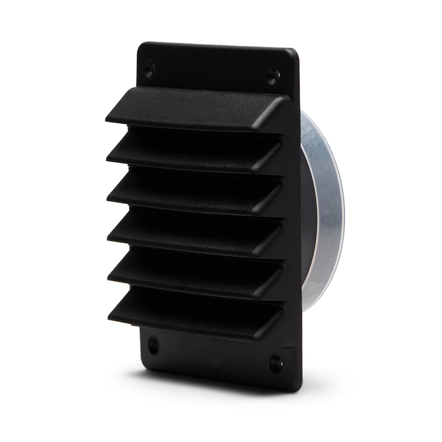 Variant av fyrkantsgaller i svart, smalare utformning för att passa in på ribbad fasad, mått 110x150 mm, med svart anslutningsstos Ø98x30. Anpassat för ventiler och avsett att användas på utvändig vägg. Försett med försänkta skruvhål för skruvmontage.