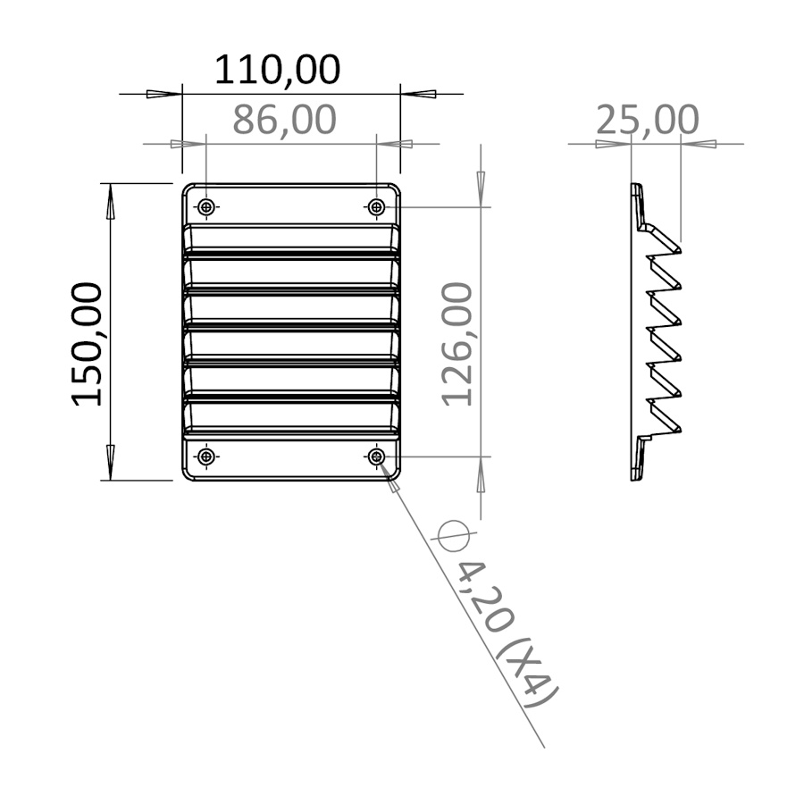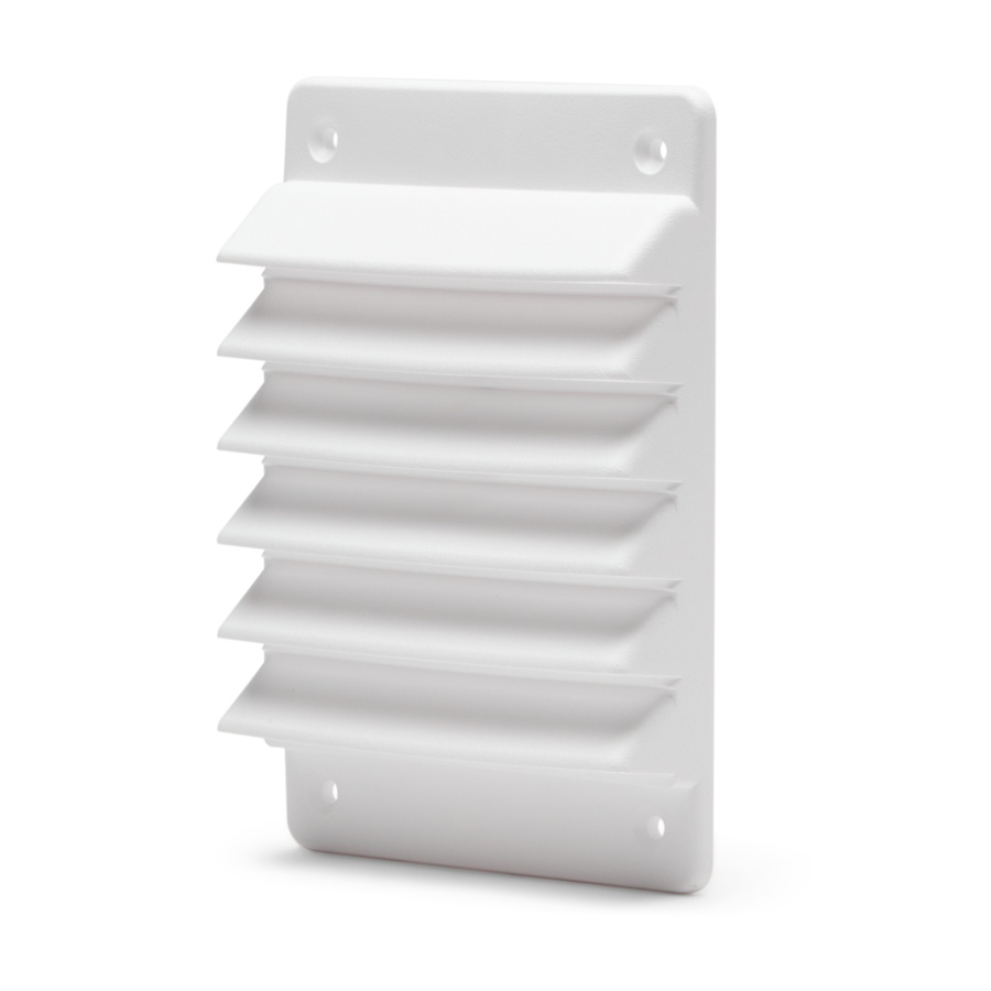 Rektangulärt ytterväggsgaller 110x150mm avsett att användas på utvändig vägg, försett med försänkta skruvhål för skruvmontage.
