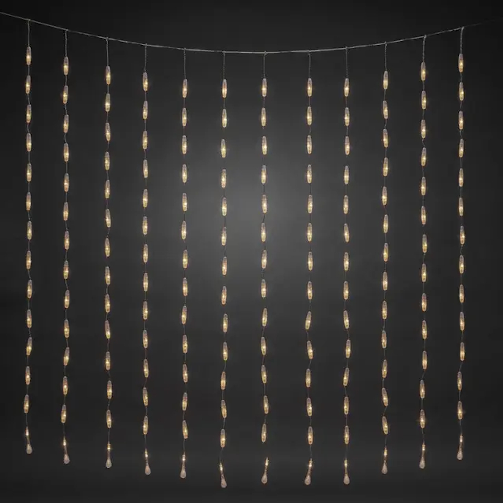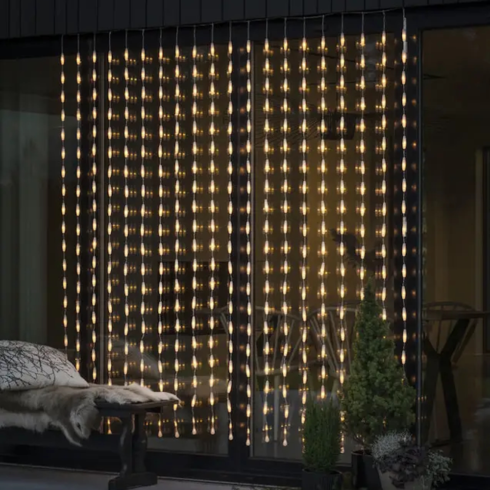Dette udendørs lysgardin er udsmykket med 400 varme hvide LED'er i dråbeform. Med en størrelse på 2x2 meter spreder det et indbydende skær og lyser mørke aftener op.