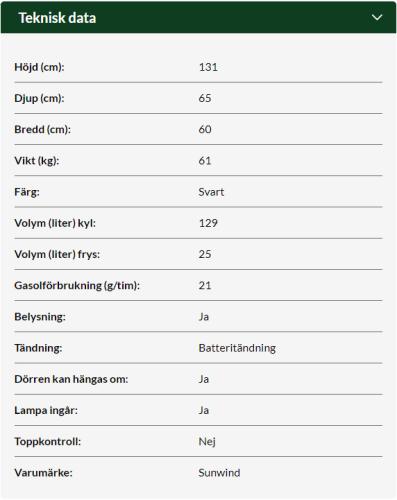 Fryseboksen har nem åbning - uden at det er nødvendigt at have plads til at åbne køleskabsdøren helt. Skabet er produceret i hvid. Døren kan hænges om. Køleskabet er termostatreguleret og har batteritænding, hvilket gør det nemmere at tænde.