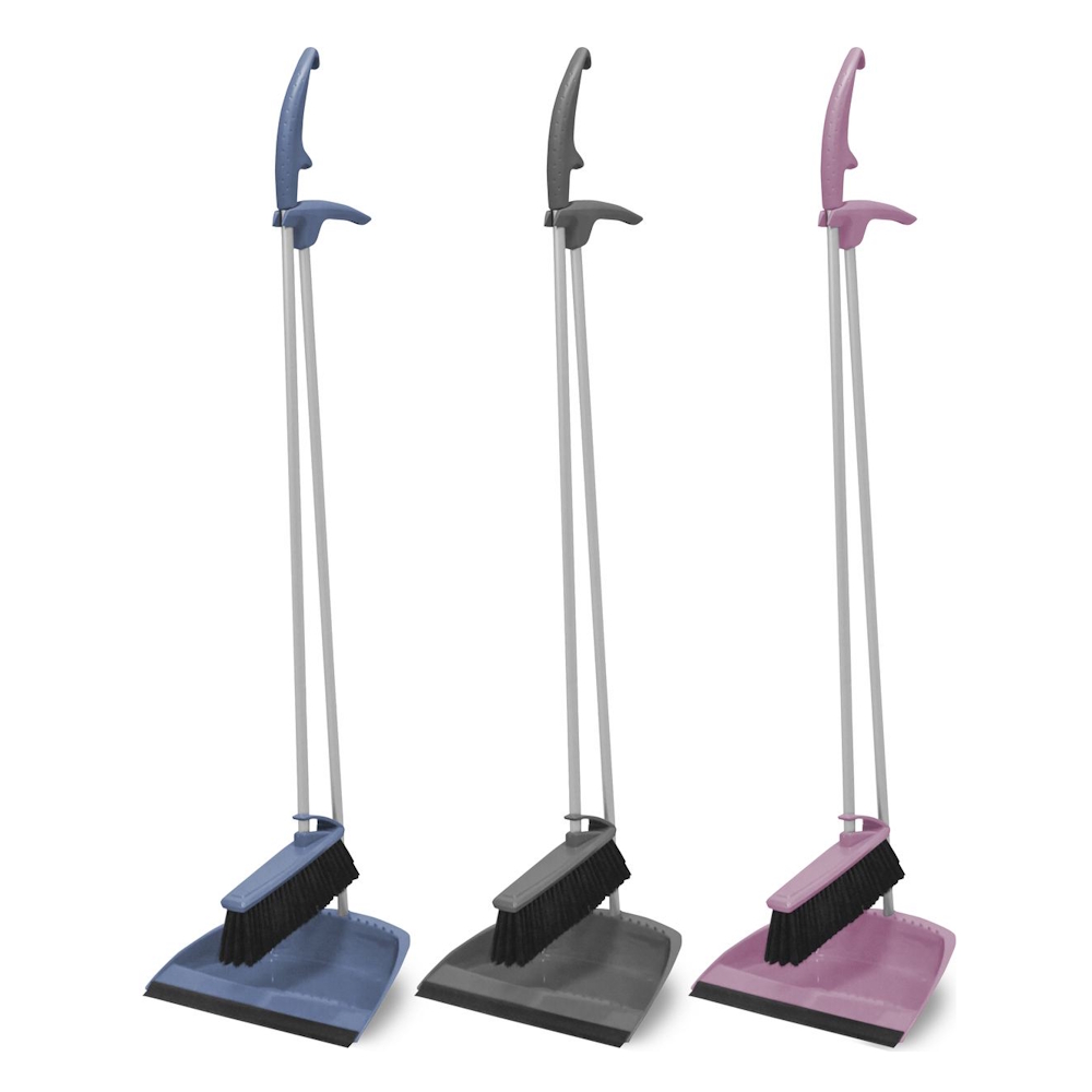 Kostesæt og skovl i tre trendy farver, pink, grå og blå. Halvlangt aluminiumshåndtag til effektiv og ergonomisk rengøring af gulvoverflader.