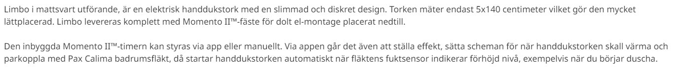Elektrisk handdukstork i svart med intelligent repetetiv Momento II-timer. Smart separat kopplingshus för enkel elanslutning/dockning av handdukstorken. Endast 24W och med lackde svarta zinkfästen, kromade krokar. För dold elanslutning, allpolig brytare/IP44/230V 50Hz/Dubbelisolerad/S/CE, kan kommunicera tillsammans med Calima fläkt.