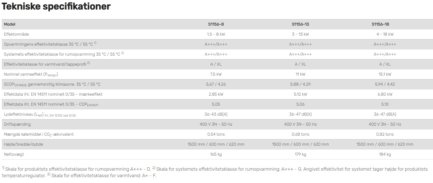 *S1156-18 har SCOP 5,94 (gennemsnitlig klimazone 35°C) i henhold til Europæisk Norm EN14825, dvs. gældende standard for bestemmelse af årlig referenceeffektivitet SCOP.