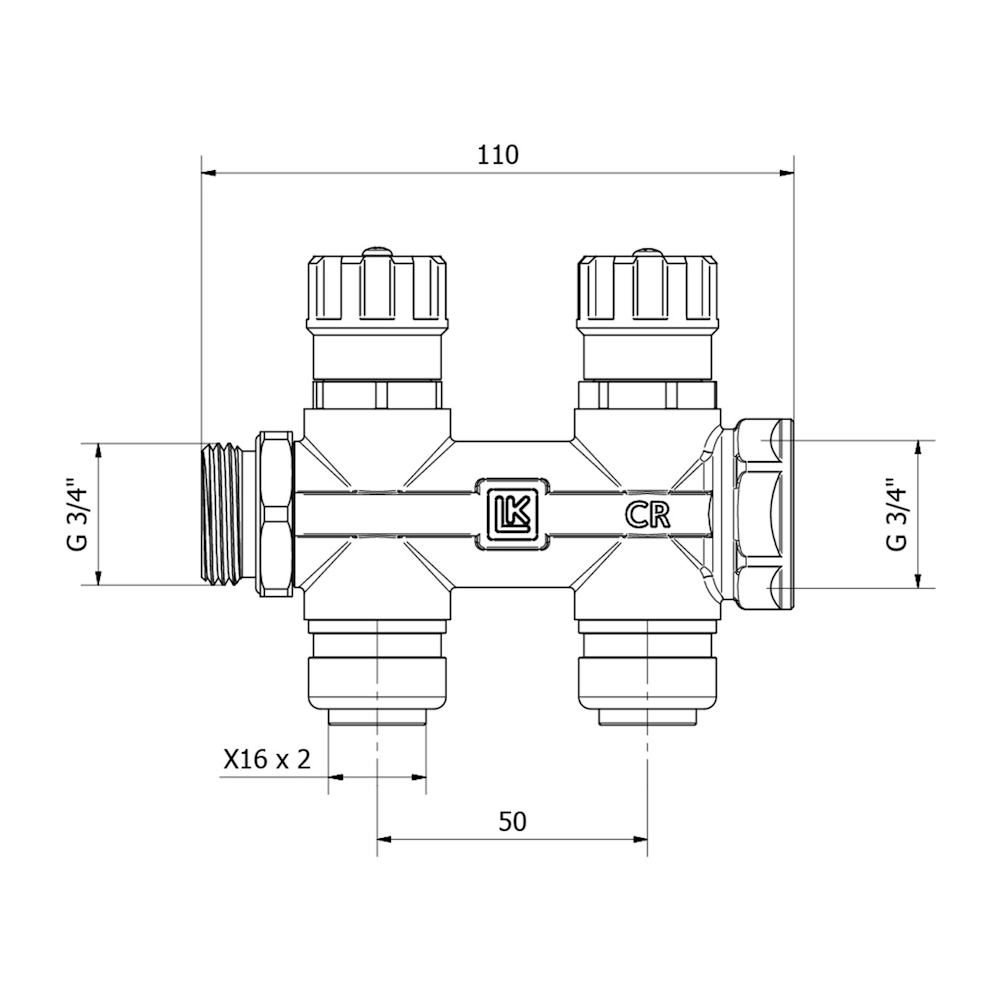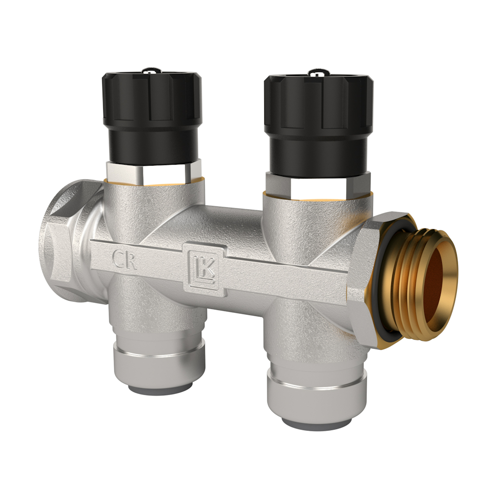 Monterbar fordeler til varme- og brugsvandssystemer. Monteres på væg eller loft med LK Fordelerbeslag eller inde i et LK Fordelerskab UNI. Fremstillet af afzinkningsbestandig messing, forniklet. Fordeleren har en G20-tilslutning (indvendig og udvendig gevind EuroCone) til fremløbet og en AX16 PushFit-tilslutning med c/c 50 mm på afgreningen. Alle typer har en O-ringstætning på den udvendige G20-side til fremløbet, hvilket letter montering af 2 fordelere uden yderligere tætning. Fordeleren har indbyggede afspærringsventiler på hver afgrening. Alle fordelere leveres komplette med monterede støttemuffer. Push-kobling beregnet til LK PE-X og PAL Universalrør.
