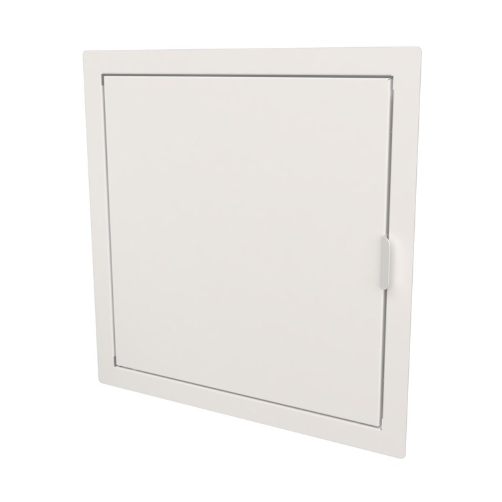 Hvid dør med hængsler og håndtag for nem adgang til LK El-skab UNI 350x350mm, når det bruges som ventilskab. Må ikke installeres i rum med vandtætning på væggen.