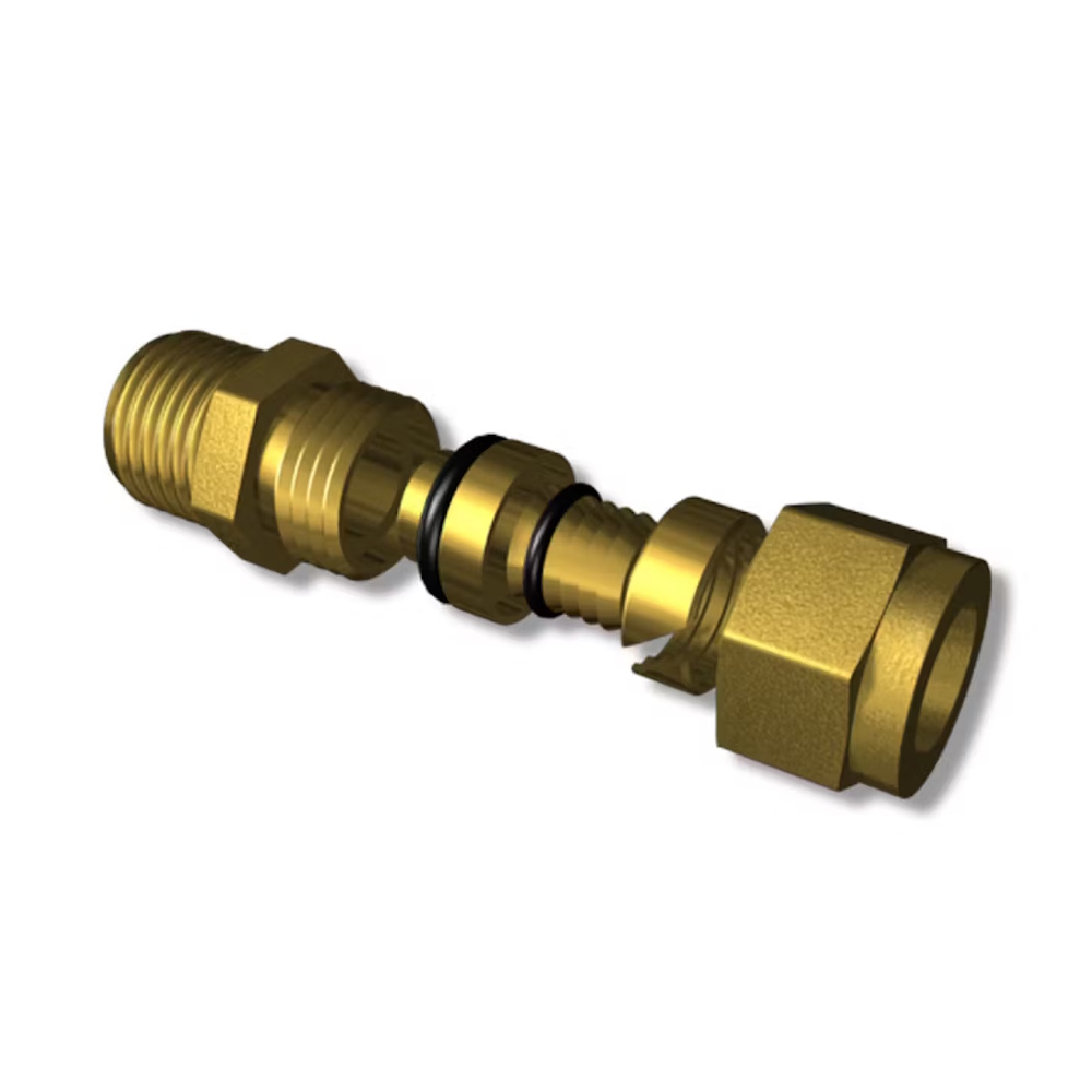 Komplet lige kobling med 1 tilslutningskobling for hver PE-X dimension og med udvendigt gevind.
