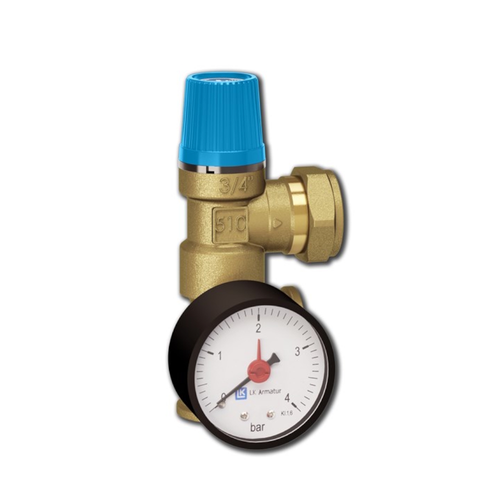 Sikkerhedspakke til varmesystemer indeholdende fordelerrør til vertikal installation,tilslutning G20,trykmåler,udluftningsventil og sikkerhedsventil.