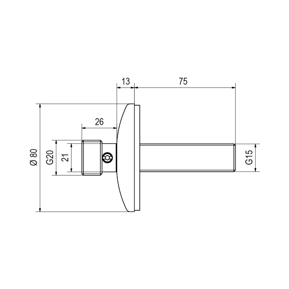 Til alle LK Vægdåser. Leveres med forkromet vægskive diameter 80 mm. Udløb G15 for tilslutning til vægdåsens vinkelnippel, 75 mm lang. Lige udløb G20 og afspærring for montering af armaturer i henhold til internationale standarder, (c/c 150 mm).