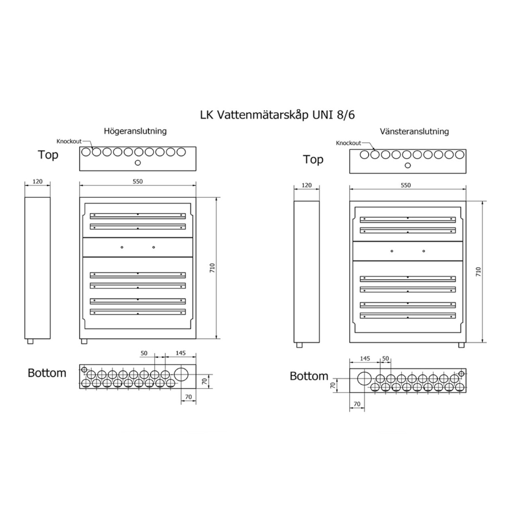 LK Vandmålerskab UNI 8/6 er et lækagesikkert præfabrikeret fordelerskab til 8 koldtvandstilslutninger, 6 varmtvandstilslutninger og med præmonteret LK Vandmålerkonsol. Tilslutning til vandmåler G25 indvendig 220/190mm med medfølgende messingadapter. Forsyning med indgående koldtvandstilførsel sker nedefra, tilslutning udvendig G25 på vinkelkugleventil. Skabet fås i to versioner til tilslutning af koldtvandstilførsel i højre og venstre side. Skabet kan ikke ombygges, da det kun har ét hul til stikledning.