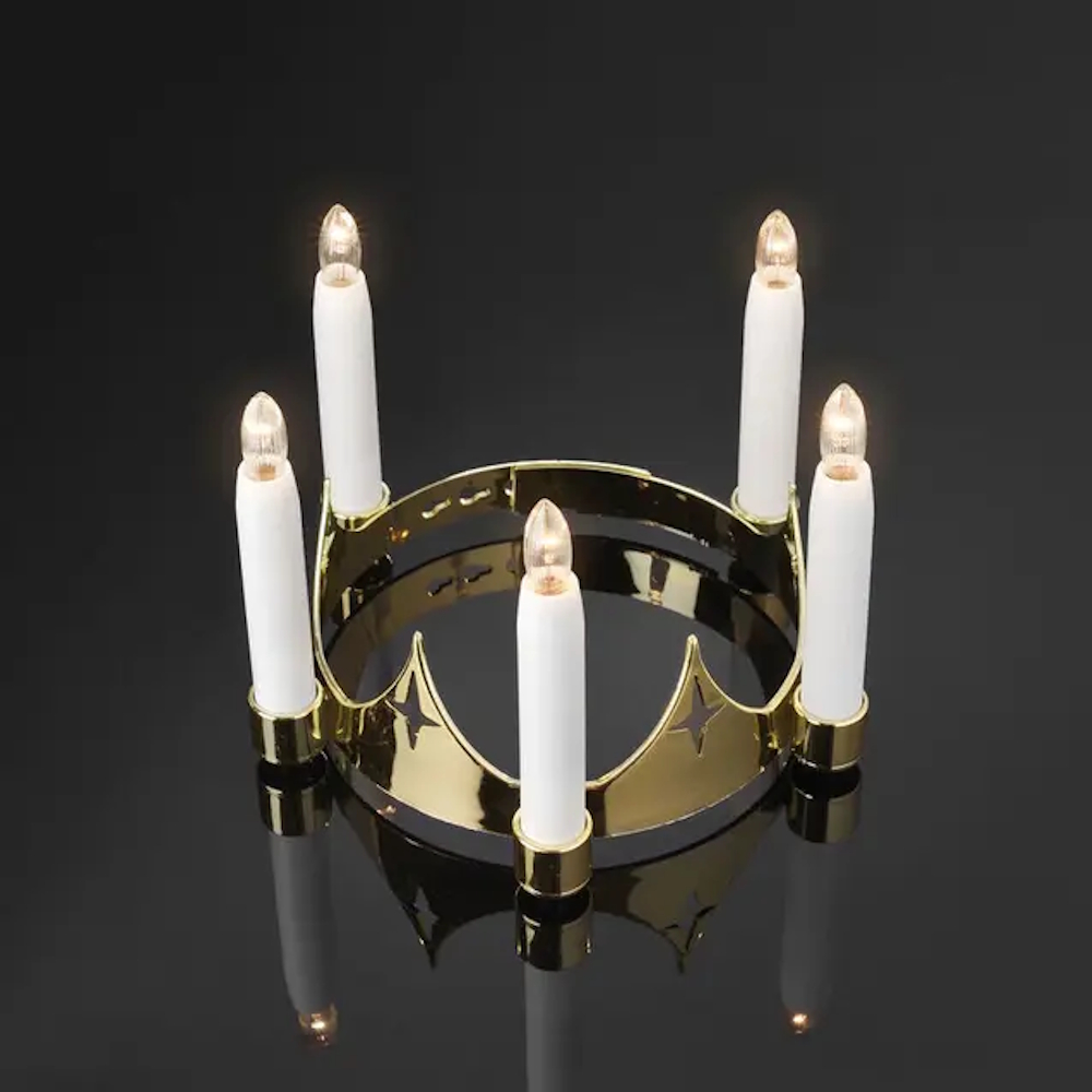 Klassisk Luciakrona i guldfarvet plastik med 5 varm hvide LED-lys. Lysene drives af 5xAA-batterier (batteri medfølger ikke).