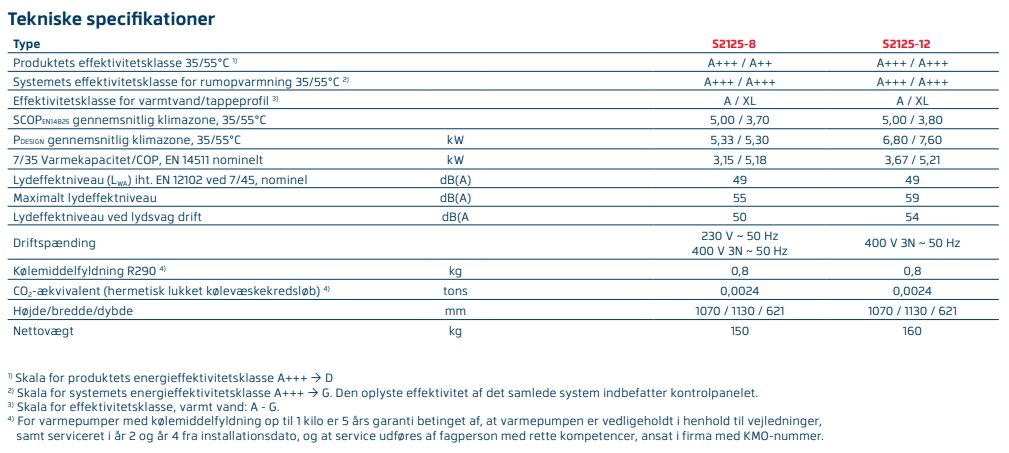 *S2125 har en SCOP-værdi på 5,0 (middelklima, lav temperatur) iht. den europæiske standard EN 14825:2018, som er standarden for angivelse af den gennemsnitlige virkningsgrad justeret for sæsonudsving, SCOP. Gælder for S2125-8.
