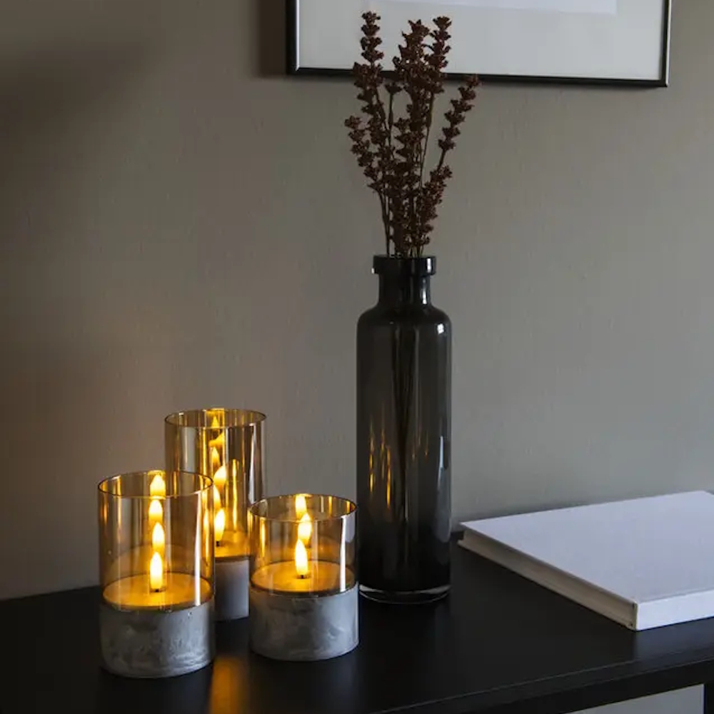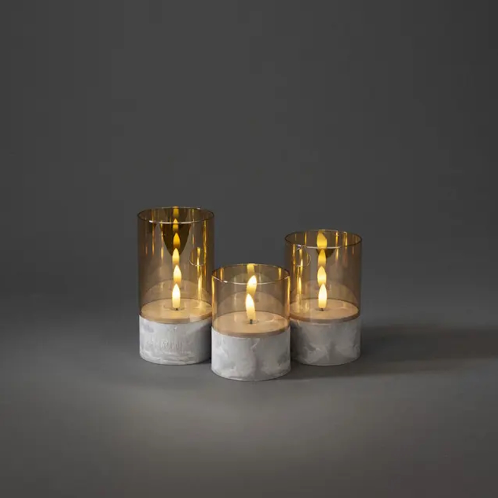 Sæt med 3 lyslygter i forskellige højder, brunt røget glas og en grå base, lysene har en 6-timers timer og drives af 2xAA-batterier.