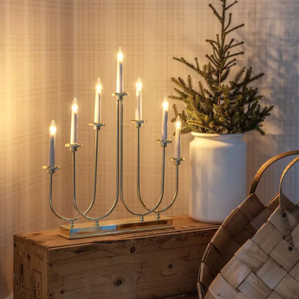 Elegant og klassisk adventsstage i messingfarvet stål med LED-lys. Den varme messingtone skaber en smuk kontrast mod det varme hvide lys og spreder en blød, atmosfærisk glød i hjemmet. En tidløs indretningsdetalje, der kombinerer tradition og design.