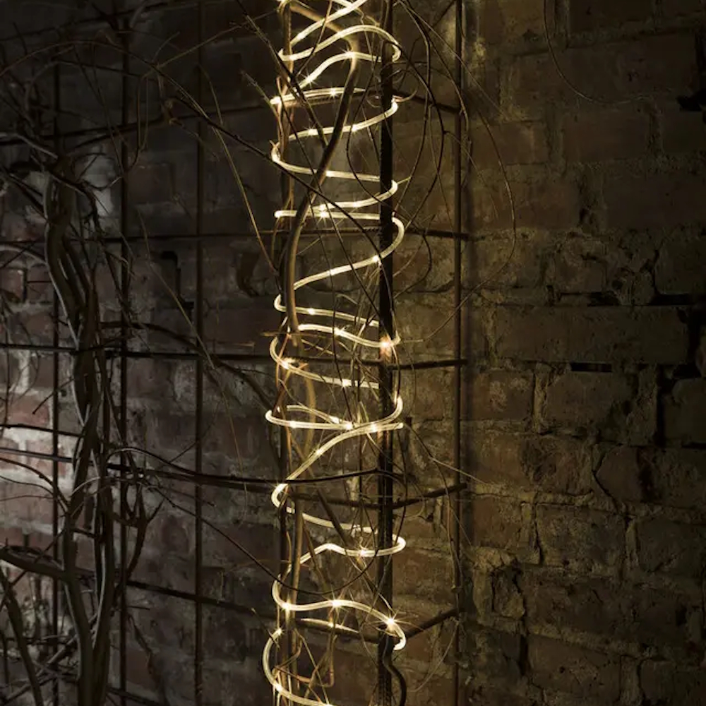 Mini lysslange fra Konstsmide med ravfarvede LED-lys og transparent slange, lysslangen har en skumringssensor.