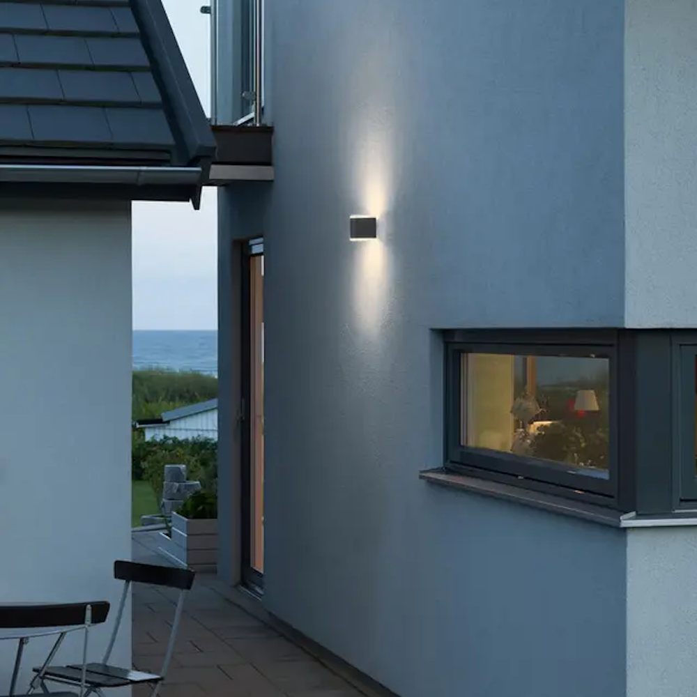 Monza er en kubeformet facadelampe i antracitgrå lakeret aluminium med opalfarvet glas. 2 stk. 6W LED. Lyser både opad og nedad.