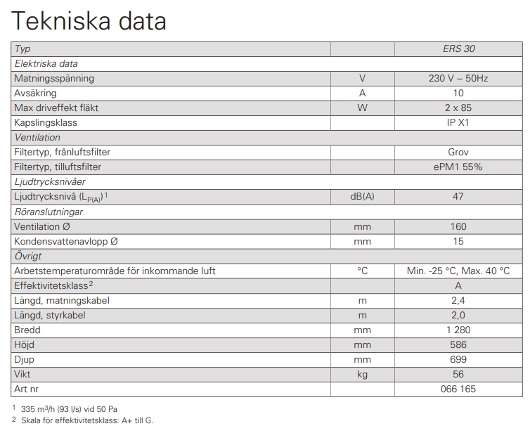 NIBE ERS 30 är en ventilationsvärmeväxlare med hög temperaturverkningsgrad upp till 94% och låg energiförbrukning. Energiklass A0+