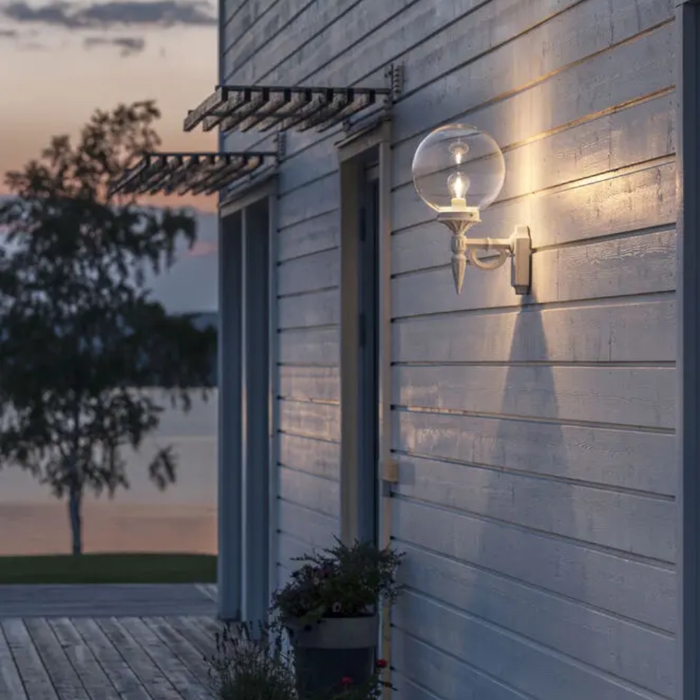 Klassisk væglampe i hvidlakeret aluminium, perfekt til montering ved indgang eller facade, IP23-klassificeret for beskyttelse mod regn.