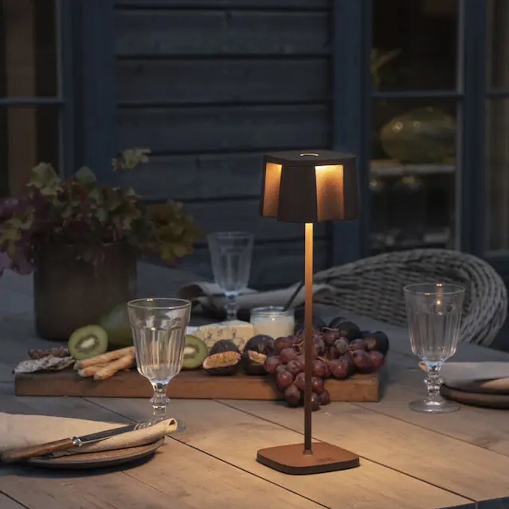 Nice er en stilfuld loungelampe med dæmpbar, justerbar belysning, hvor du kan vælge en farvetemperatur mellem 2700K eller 3000K, og den har tre forskellige lystilstande, der skaber smukke lysbilleder. Denne dekorative belysning er bærbar og passer lige så godt i stuen som på terrassen. Oplades via USB og har en batterilevetid på cirka 9 timer ved fuld lysstyrke. Tænd/sluk-knap øverst på skærmen. Rustfarvet, malet aluminium.