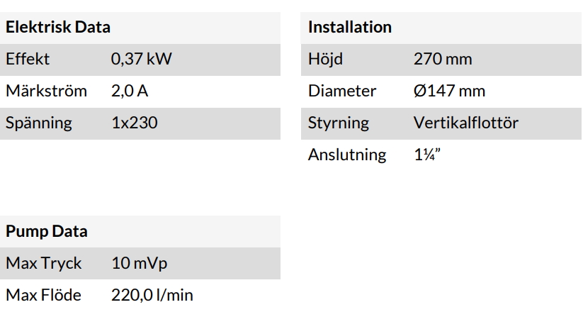 Pumparna har en vertikalflottör som ger ökad driftsäkerhet eftersom den inte kan hänga sig på andra objekt och gör det även möjligt att installera i en mindre pumpgrop. Tänk på att om pumpgropens diameter bör vara anpassat för inkommande flödet.