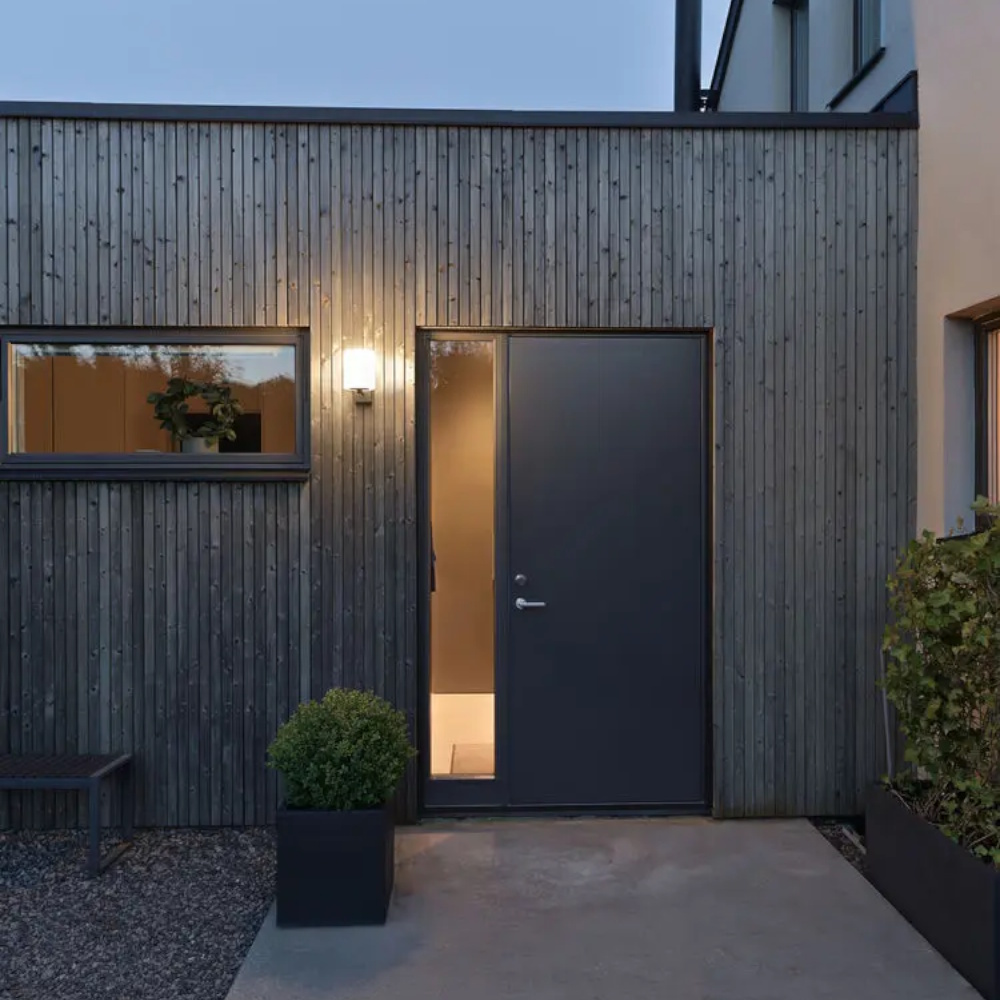 Portici facadebelysning med en smuk, opalfarvet skærm og beslag i sortlakeret stål, giver din entré en imødekommende følelse.