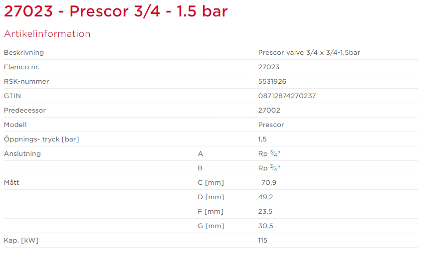 Prescor säkerhetsventil 1,5bar G20xG20