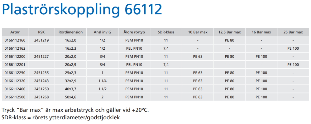Tryck och temperatur: Max arbetstryck: Respektive rörtyp avgör, se tabell nedan. Arbetstemperatur: Respektive rörtyp avgör, koppling max +95ºC.