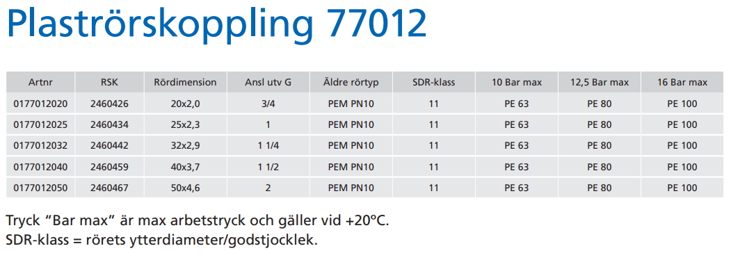 Konstruktion: Plaströrskoppling med lös stödhylsa för PE rör. Rak med utvändig gänga. Dimension 20-50 med mutter i mässing och klämring i plast. Standardmodell med stödhylsa för PEM PN10 (SDR 11) medföljer. För andra PE rör bytes stödhylsa till rätt godstjocklek, se varianter på artikel 7700.