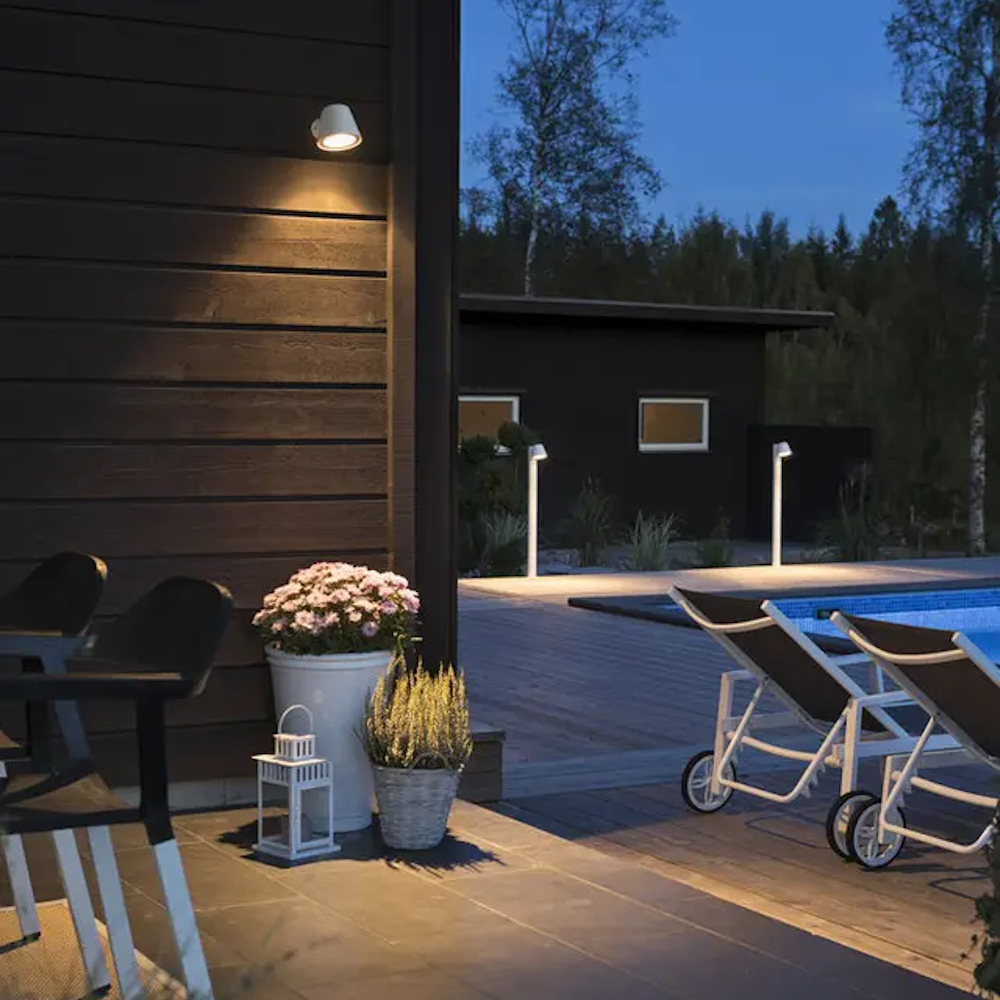 Trieste facadebelysning i hvidlakeret aluminium med klart glas - lyset er rettet skråt nedad for et effektivt lysmønster.