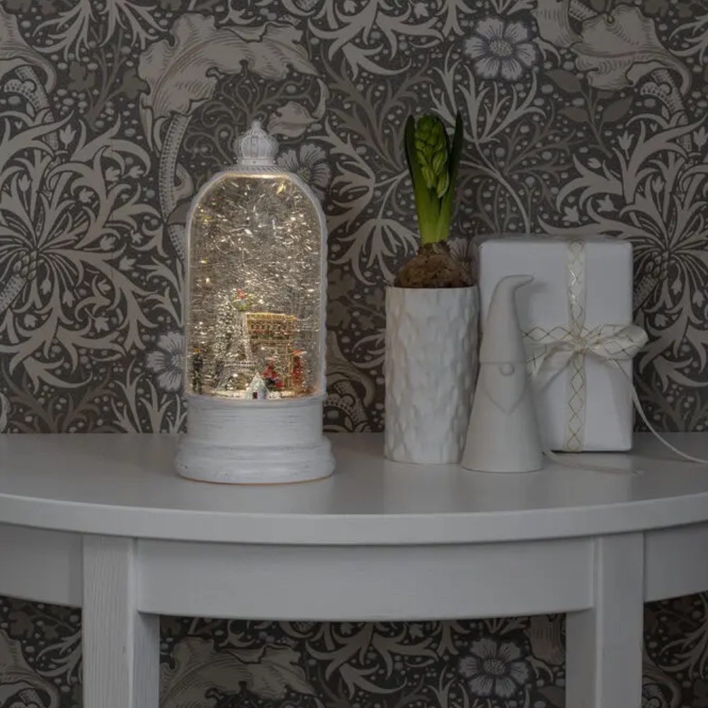 Eksklusiv snekugle med Paris-seværdigheder Eiffeltårnet, Triumfbuen, Louvre og detaljerede figurer med roterende funktion. Hvirvlende glimmer, varm hvid LED og 5-timers timer. Drevet af 3xC-batterier (medfølger ikke) eller USB. 1,8 meter USB-kabel medfølger.