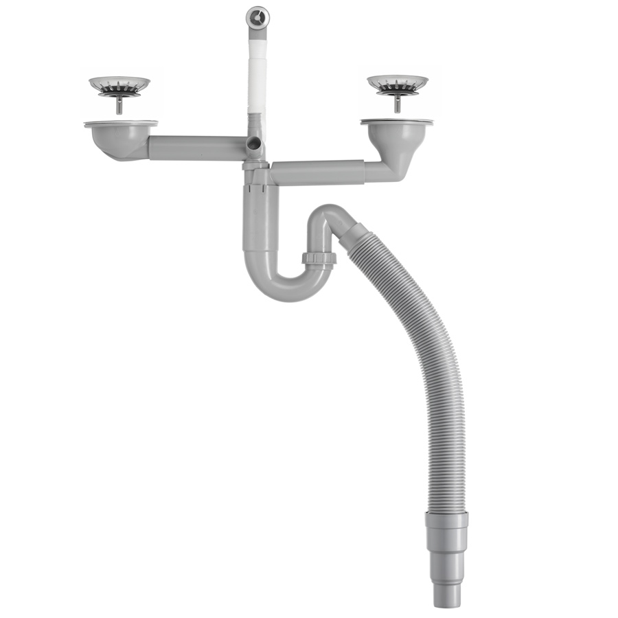Vattenlås med integrerade korgventiler i teleskopsarmar och flexibel utloppsslang kpl. med bälgrörsmuff 40/50.