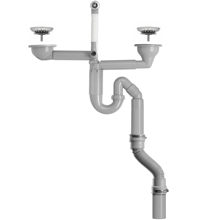 Vattenlås med integrerade korgventiler i teleskopsarmar och stretchslang, flexibel i längd från 200-520mm, anpassat för montage i höj/sänkbara underskåp. Dimension 50mm.